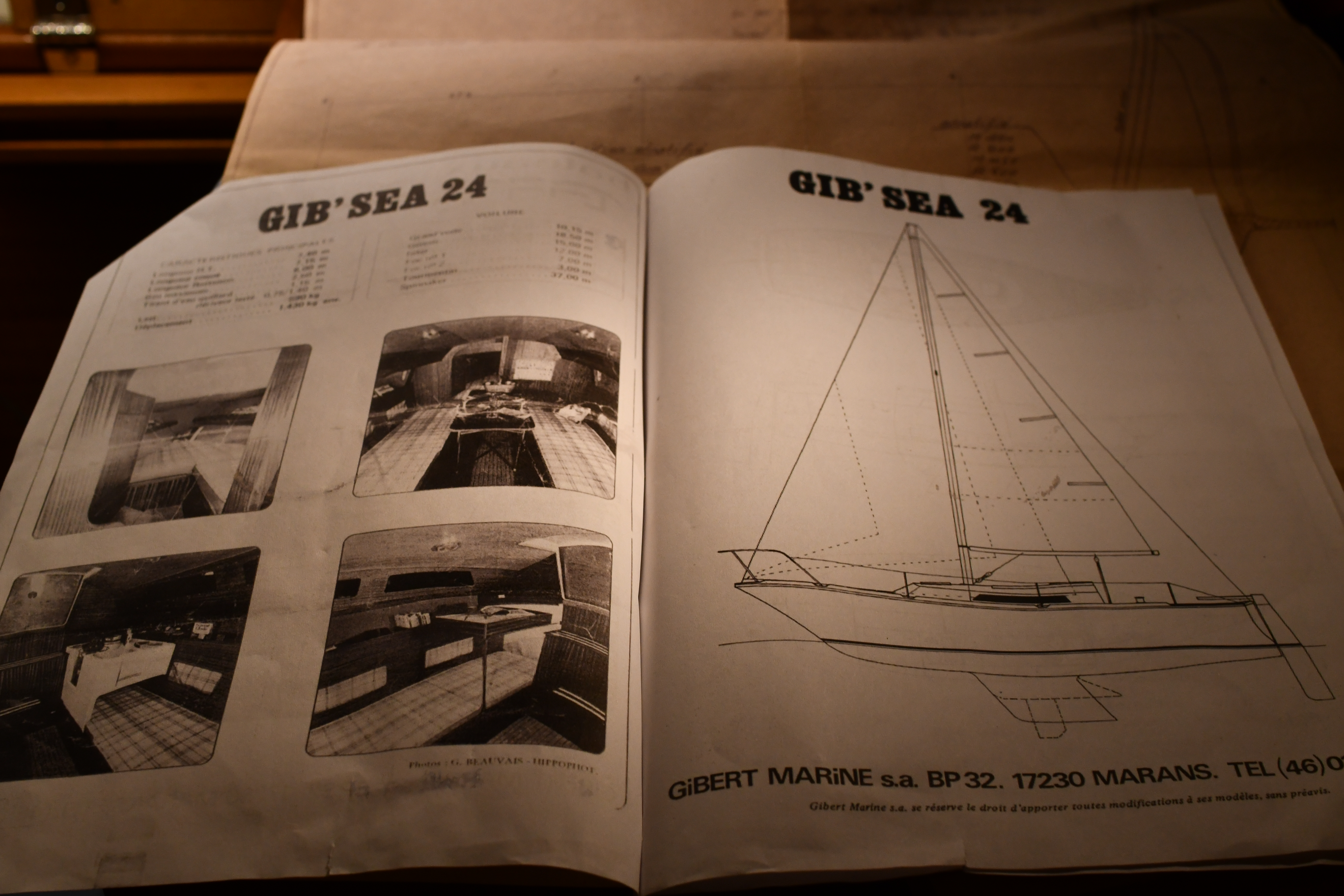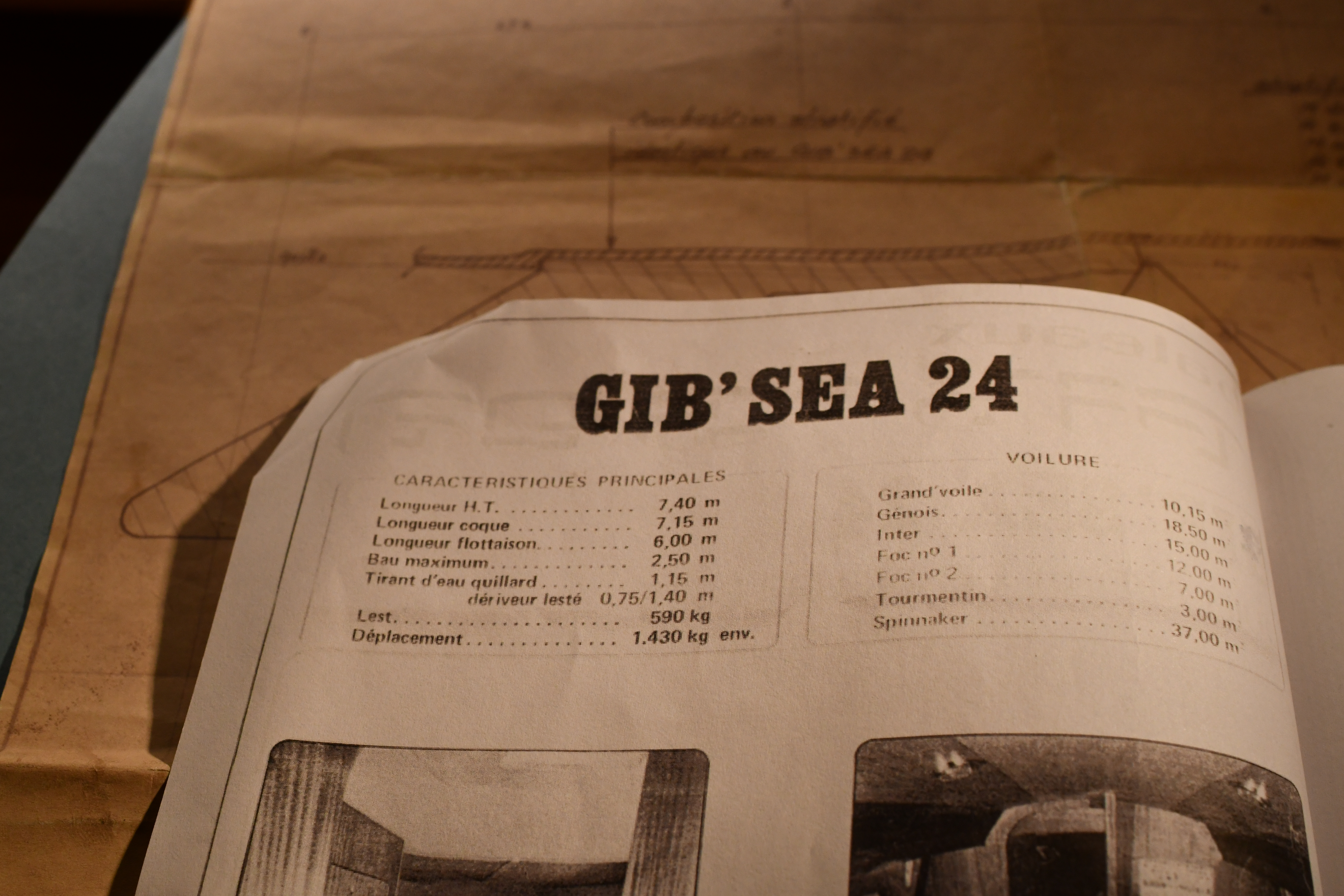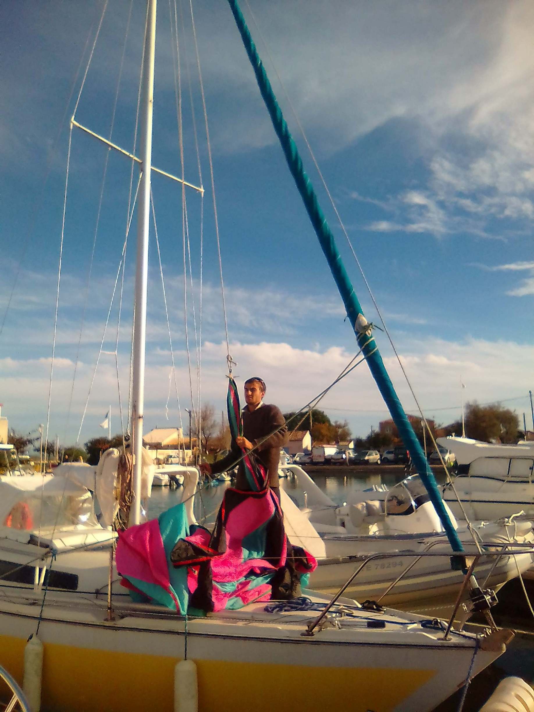 Sont rangés dans la soute à voiles, un Spi « années 80 », un Foc, et un Tourmentin. Un tangon pour monter le spi et un étai largable pour le Foc et le tourmentin.