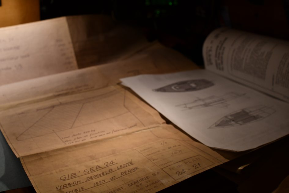 Piana est un Gib’Sea 24 version dériveur lesté, il dispose d’une dérive que l’on peut monter ou descendre. Le tirant d’eau (équivalent à la profondeur d’eau nécessaire au bateau pour ne pas toucher le fond) peut varier de 1m 40 à 75 cm. 75 cm, c’est peu, et cela laisse autant de possibilités de mouiller l’ancre dans des coins sympas proche de la plage ou des rochers pour les grimpeurs…