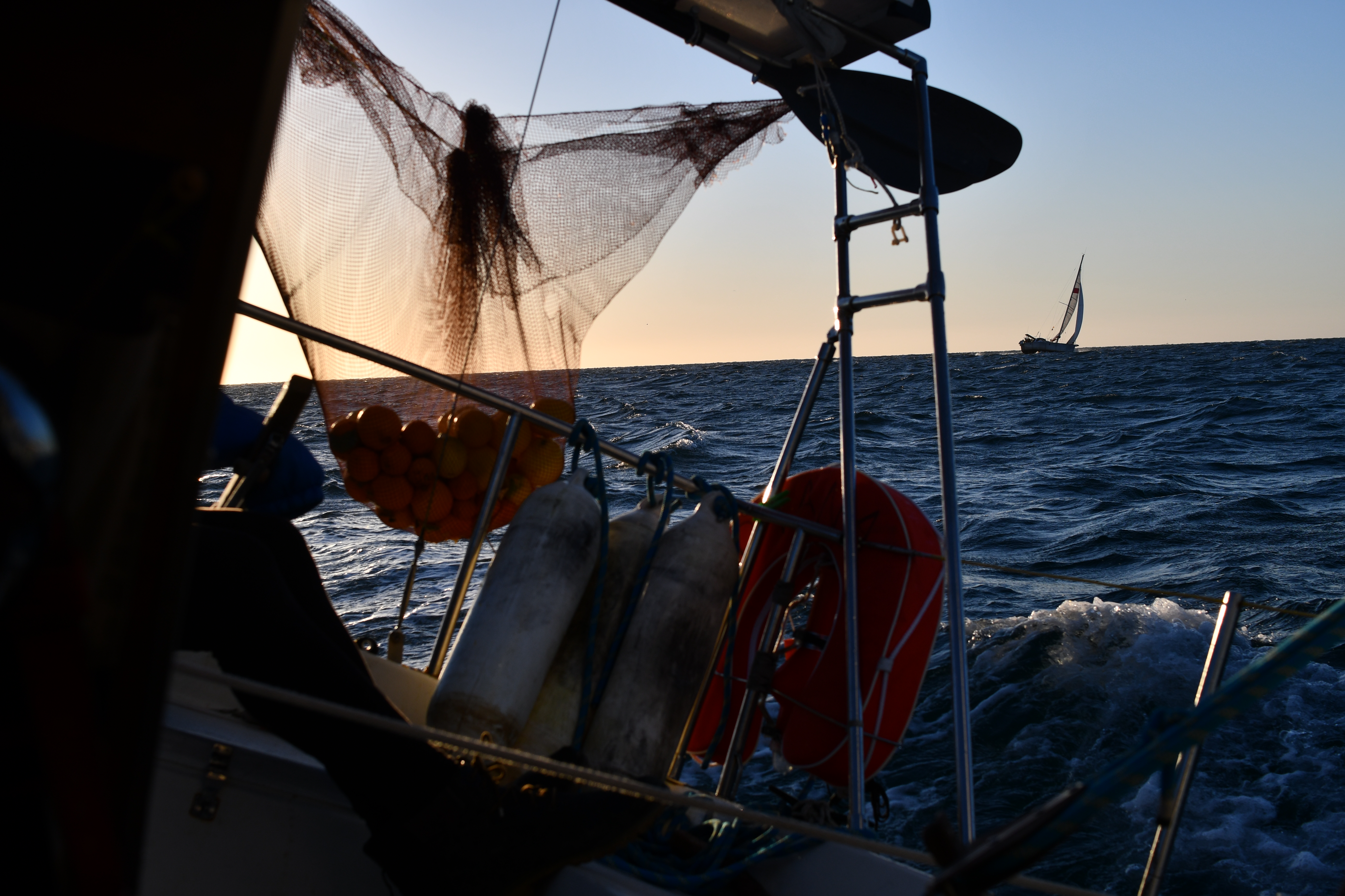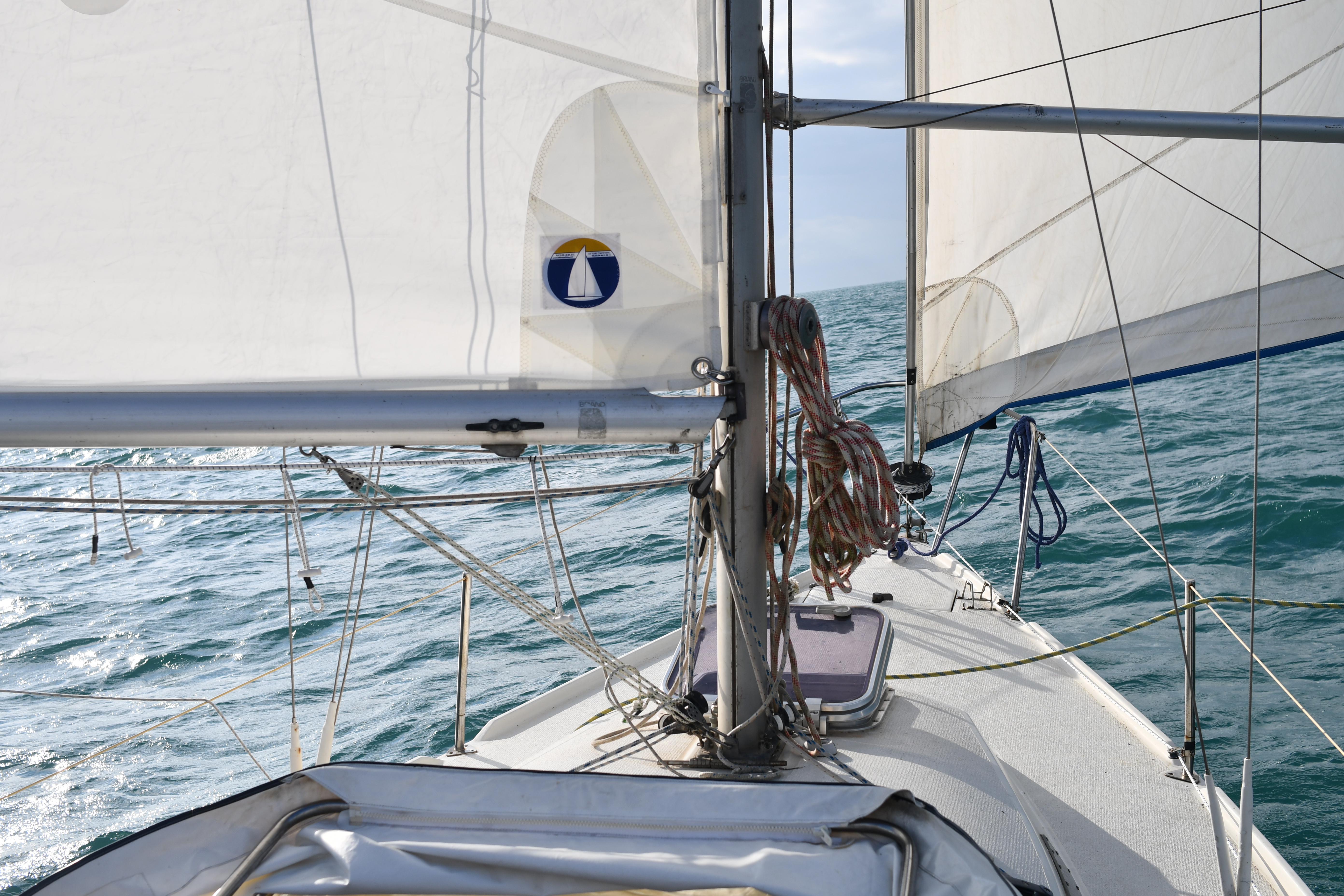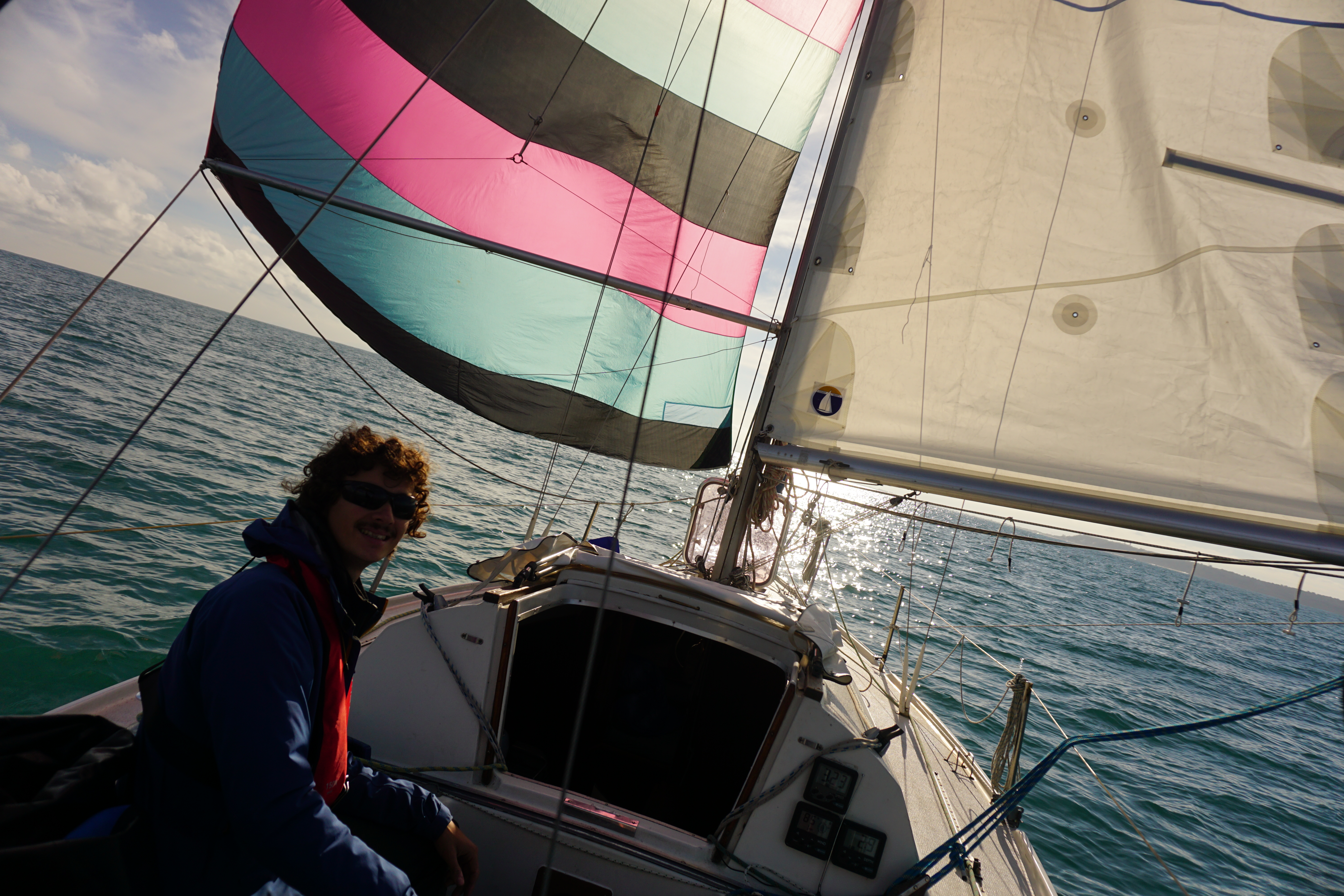 Nous partons au portant, le génois tenu avec le tangon et faisons route à 7 nœuds bien