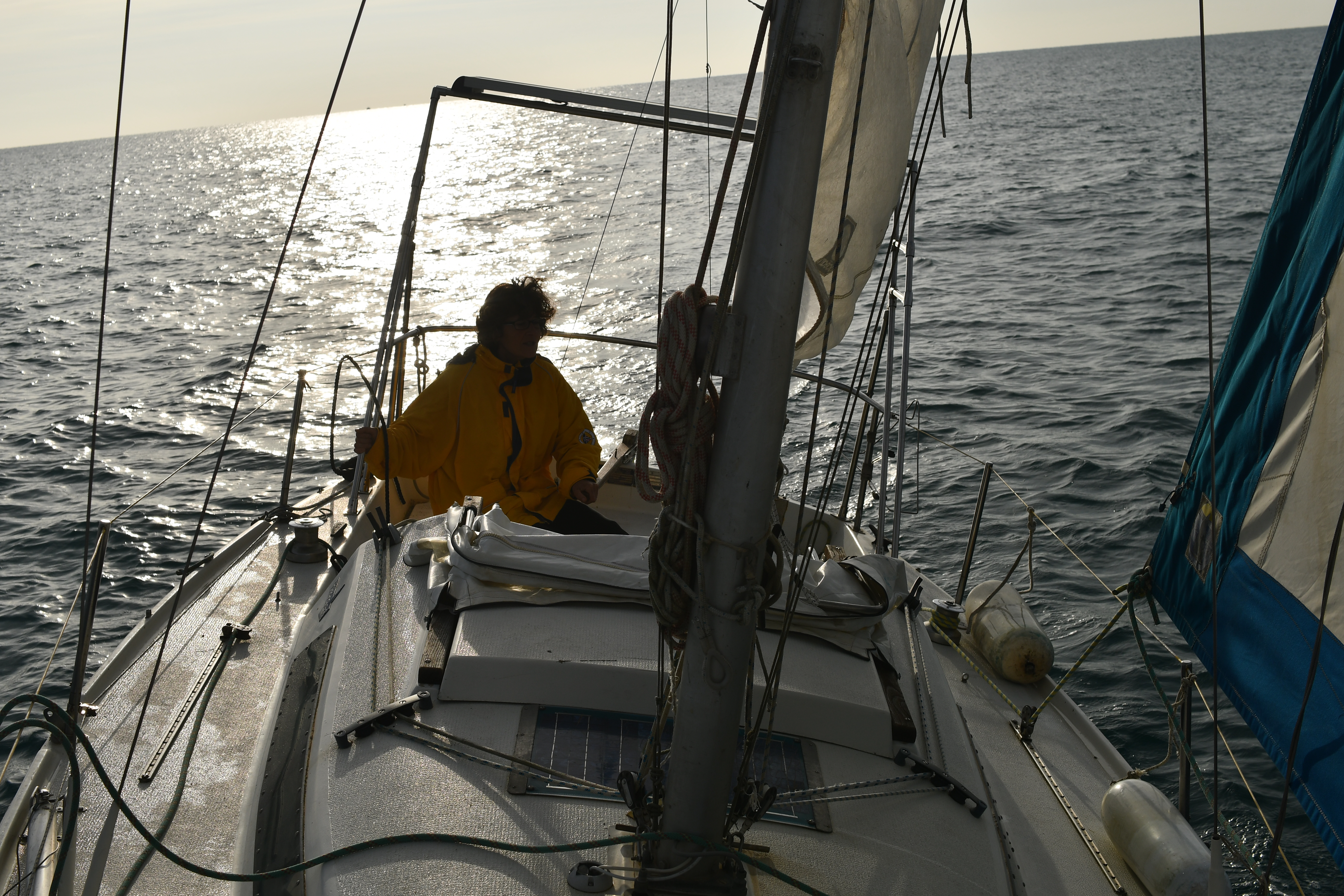 Marion à la barre admirant les dernières lueurs du soleil