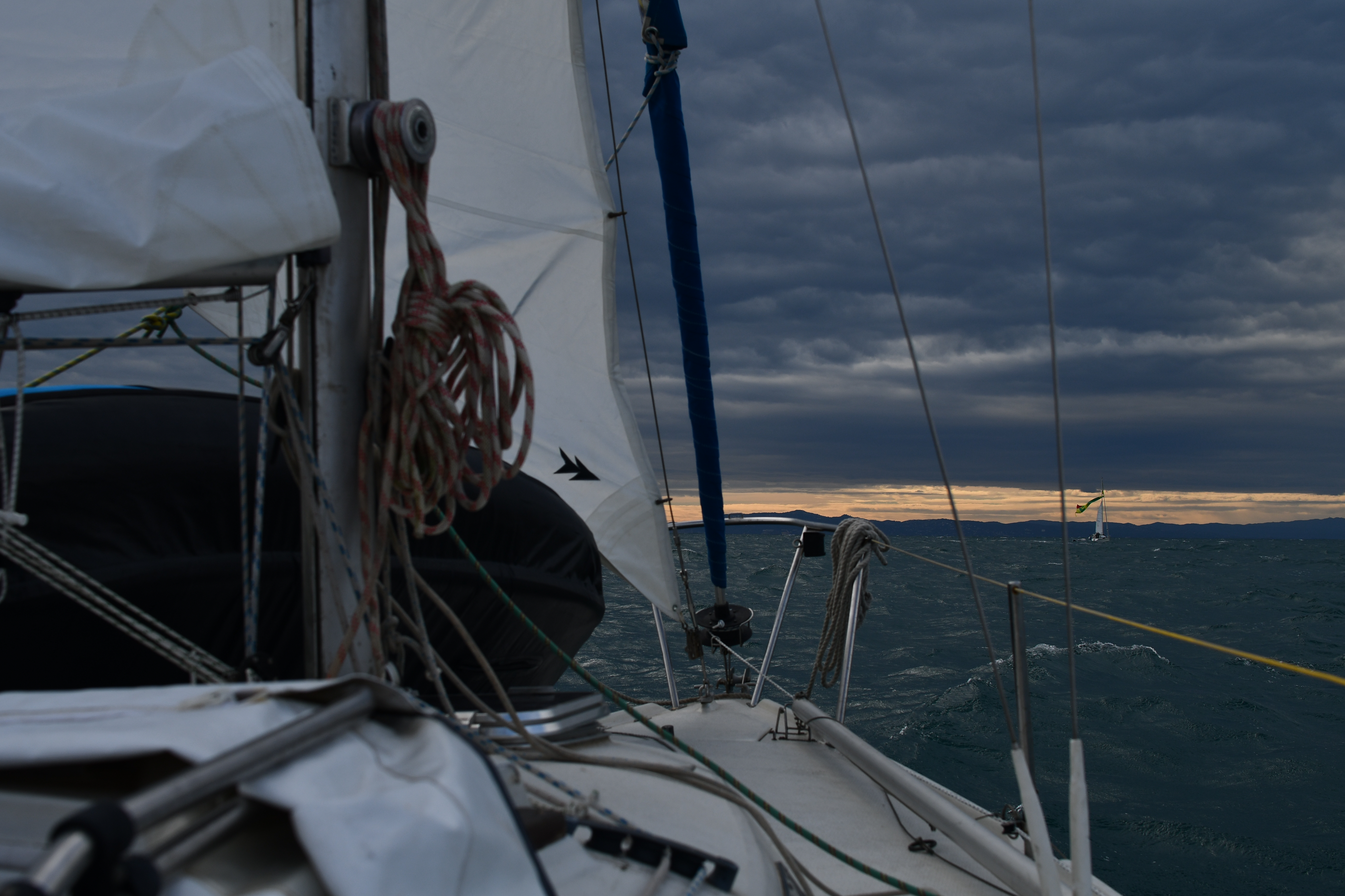 Juliette se porte bien, sans radio et avec un spi déchiré autours du génois. Nous les rattrapons avec 30 nœuds de vent, deux ris et le tourmentin…