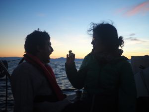 Morgane et Jéremy, petit déj aprés une navigation de nuit au large de Frontignan.