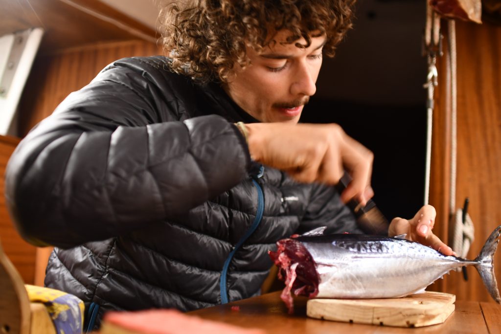 Préparation de la bonite pêchée en rejoignant les Suisses au large !