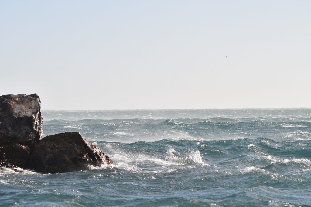 Après une première tentative d’entrée dans un port pour nous abriter, nous faisons demi tour. L’étroitesse du couloir d’entrée entre les digues du port et la forte
